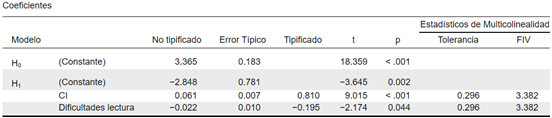 De este modo, el modelo final quedó compuesto por dos variables predictoras: Coeficiente Intelectual y Dificultades de lectura.