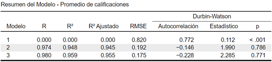 Continuando con nuestro análisis, nos encontramos con la tabla Resumen del Modelo. El valor de R2 Ajustado indica el porcentaje de varianza explicado por el modelo. Así, encontramos que el modelo final, con dos variables, predice un 95,5% de la varianza del Promedio de las calificaciones. El estadístico Durbin-Watson comprueba que las correlaciones entre los residuos se encuentran entre 1 y 3, como se requiere. En nuestra tabla podemos observar que el valor de este estadístico es de 2.285, lo que sugiere una ligera tendencia negativa. No obstante, no hay autocorrelación significativa en los residuos (p = 0.771).