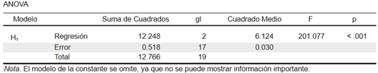 - Desde el resumen del ANOVA, la prueba F evalúa la hipótesis de que el modelo no explica ninguna variación en la variable dependiente. Es decir, que no existe una relación lineal significativa entre la variable dependiente y el conjunto de variables predictoras que hacen parte del modelo, lo cual implicaría que la pendiente del plano de regresión es igual a cero (horizontal) (Betanzos y López, 2017).