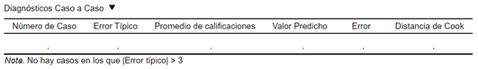 Por último, si nuestra tabla de diagnóstico por casos está vacía, son buenas noticias. Esta tabla muestra los casos (filas) con residuos que se encuentren a 3 o más desviaciones estándar respecto a la media. Los casos con los errores más grandes podrían ser valores atípicos.