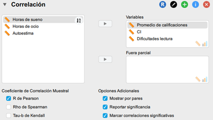 Añadiremos en primer lugar nuestra variable dependiente, y luego el resto de variables con que trabajaremos. Así, las primeras correlaciones que encontremos en JASP serán aquellas que tenemos que analizar.