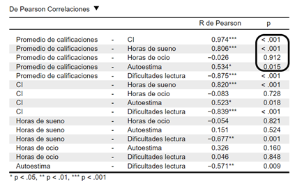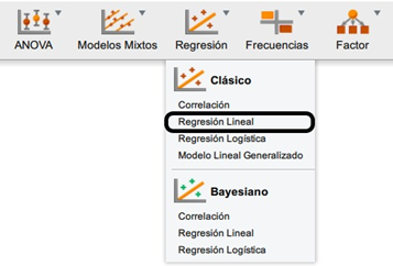 En este caso, encontramos que la correlación del CI, las Dificultades de lectura, las Horas de sueño y el Autoestima es significativa con el Promedio de calificaciones. Por otra parte, las Horas de ocio no se encuentran significativamente relacionadas al Promedio de calificaciones, puesto que su valor-p es mayor al valor crítico establecido (p < 0.05); y, por lo tanto, será una variable que no incluiremos en nuestro modelo de regresión. Para realizar el análisis de regresión lineal, volveremos a dar clic en la opción Regresión del menú superior. Luego, en el apartado clásico, damos clic en regresión lineal