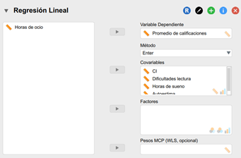 Para este ejemplo, usaremos el método Enter. Este es el método predeterminado de JASP, en el que todos las variables predictoras se introducen en el modelo en el orden en que aparecen en la caja Covariables.