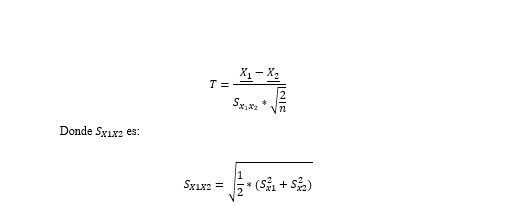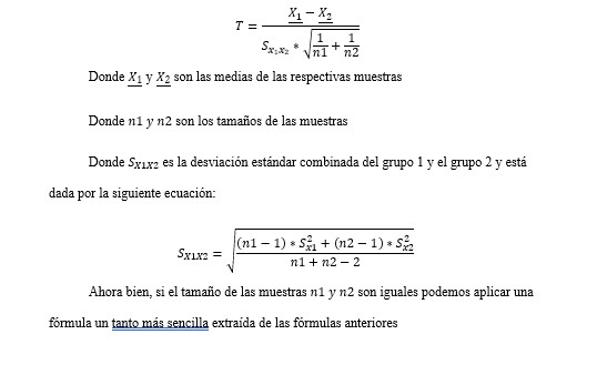 La fórmula para el estadístico T con muestras independientes con n iguales o con diferencias en ellos, está dada por