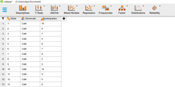 En nuestro ejemplo, tenemos un grupo al que se le da a beber café y otro al que no se le da nada de tomar. Esto, para saber si el grupo al que se le administró el café tiene diferencias significativas con la segunda muestra al comparar su nivel de sueño (en nuestro ejemplo contamos con un n de 31 en nuestros dos grupos por lo que una de las condiciones ya se cumple). Las siguientes imágenes ilustran cómo realizar una prueba T en JASP, primero debemos tener los datos con los valores previamente cargados en JASP como en la siguiente imagen