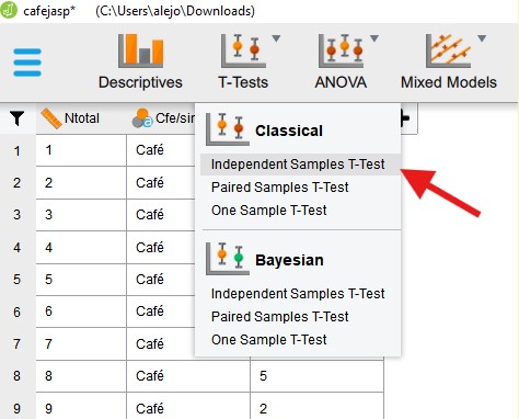 Después de tener cargados nuestros datos, debemos clickear en T-Tests y después en Independent Sample T-Tests como se muestra en la siguiente imagen: