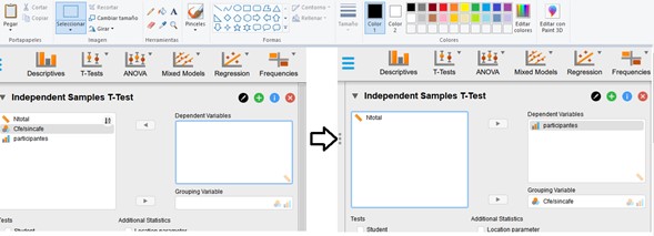 El siguiente paso para realizar la prueba T es pasar las variables y los tipos de grupos a sus respectivos lugares como podemos ver en la siguiente imagen:
