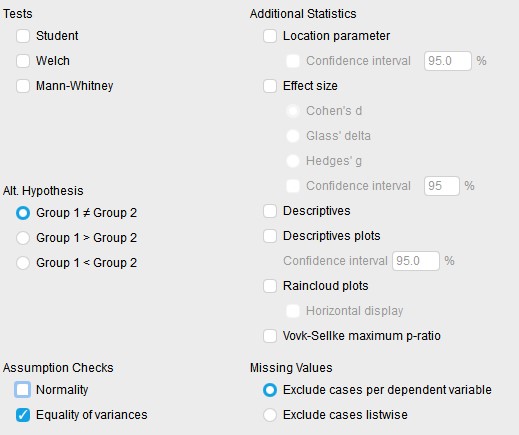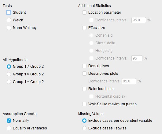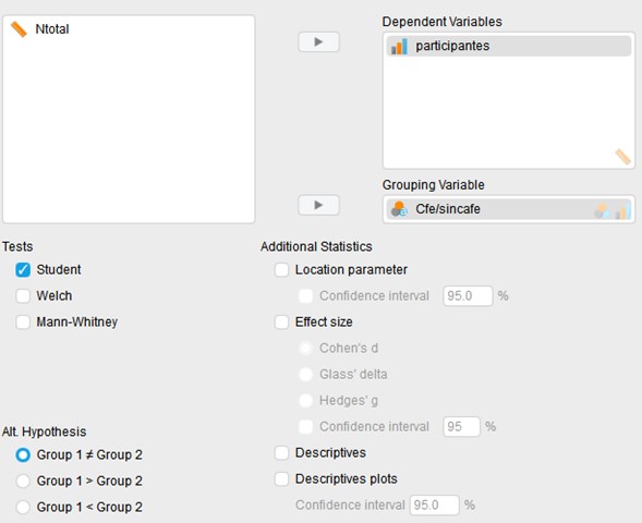 Habiendo comprobado que nuestros datos cumplen con los requisitos de una prueba T podemos realizarla dando click en el botón Student y asegurándonos que nuestra hipótesis alterna es que hay diferencias entre grupos clicamos la opción Grupo 1 ≠ Grupo 2