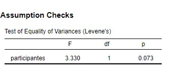 Y nos aseguramos de que nuestro valor p sea mayor a 0.05, en este caso nuestro valor p es de 0.073 lo que nos hace aceptar que no hay diferencia entre las varianzas de los grupos.
